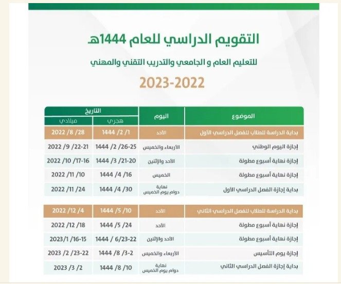 أعلنت وزارة التعليم في المملكة العربية السعودية عن موعد بدء العام الدراسي الجديد 1444، كما أوضحت أن التقويم الأكاديمي 1444 بعد التعديل ينقسم إلى 3 فصول دراسية، حيث يبدأ التقويم الأكاديمي 1444 في اليوم الأول من صفر 1444ه، لجميع الطلاب في المدارس والجامعات.