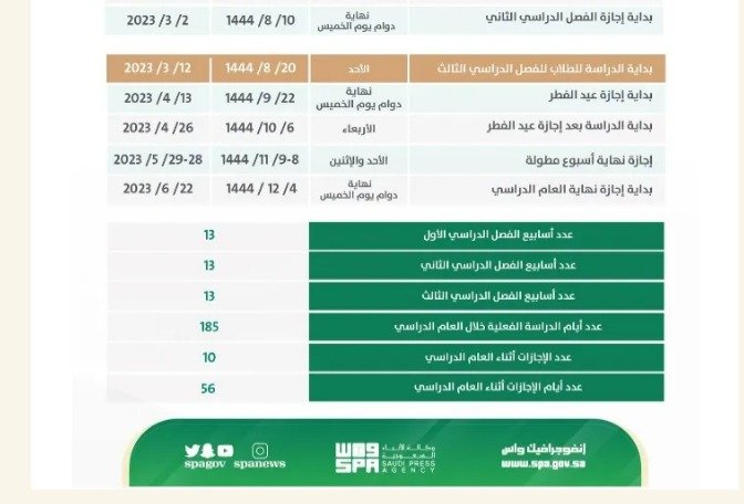 كما أعلن الجدول الدراسي ١٤٤٤ بعد التعديل عن موعد عطلة نهاية العام 1444 يوم الخميس الذي يصادف 4-12-1444 هجرية، وهو موعد انتهاء امتحانات الفصل الدراسي الثالث.
