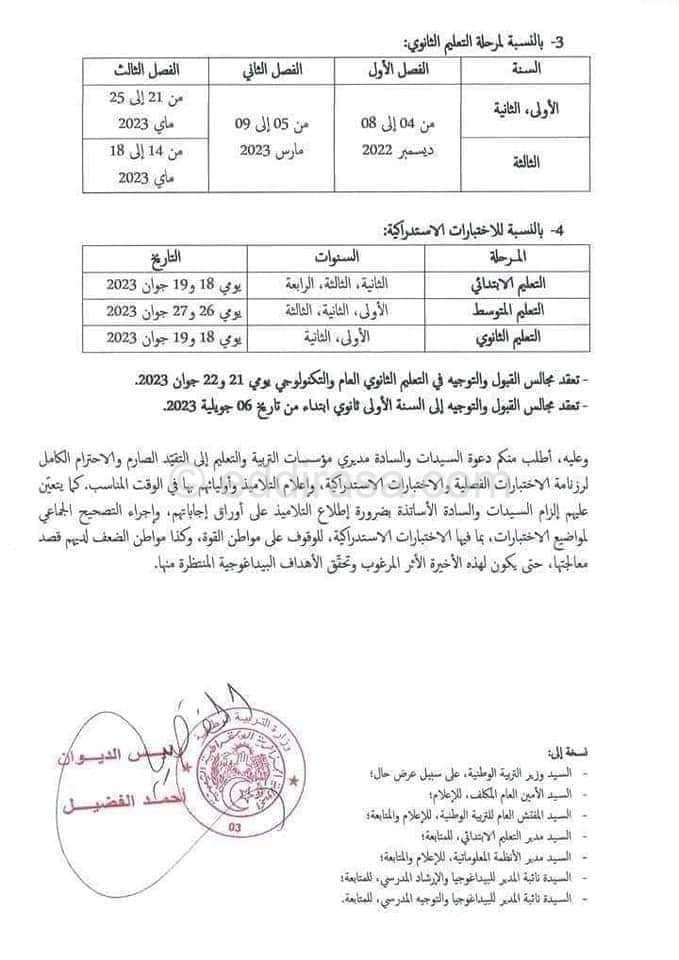 أما بالنسبة لامتحانات الفصل الدراسي الثاني فستكون بين 05 و 09 مارس 2023 للمتوسطين والثانويين ، وللابتدائي بين 07 و 16 مارس 2023.