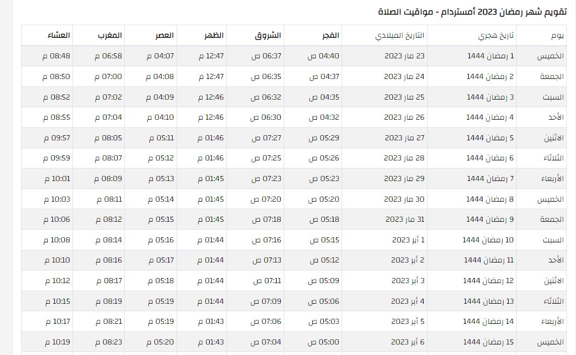 امساكية رمضان 2023 في هولندا، يبدأ شهر رمضان هذا العام ، 2023 الميلادي ، 1444 الهجري ، في أمستردام ، هولندا يوم الخميس 23 مارس 2023، وينتهي يوم الخميس 20 أبريل 2023، لذلك ، يتكون شهر رمضان هذا العام من 29 يوما.