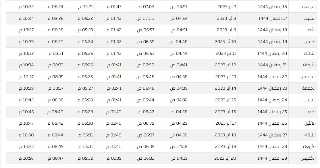 بينما في اليوم الأخير من رمضان ، يكون وقت أذان الفجر 04:15 ووقت أذان المغرب 20:47 بمدة نهار 16 ساعة و 32 دقيقة.