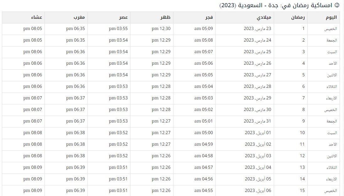 امساكية رمضان 2023 في جدة